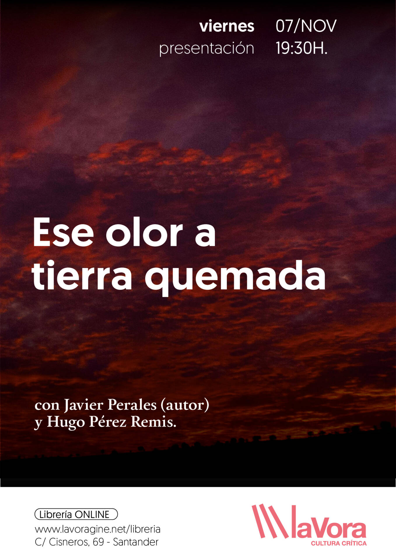 Javier Perales presenta Ese olor a tierra quemada, su séptimo libro, editado por La Única Puerta a la Izquierda. Un poemario con el subtítulo, Poesía para los que aman la prosa, cargado de versos de alto contenido social y de protesta, pero a la vez repleto de ironía y humor negro, también, marca de la casa, guiños constantes a la iconografía pop de siempre, Generacion Beat, rock y cine clásico. En la presentación intervendrán el autor y el también poeta Hugo Pérez Remis.
