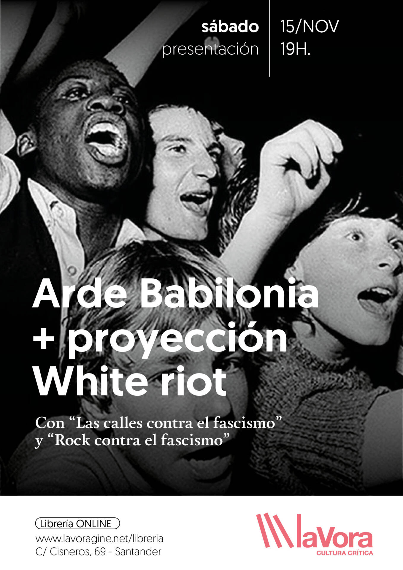 La asamblea "Las Calles contra el Fascismo" organiza los días 15 y 16 de noviembre unas jornadas culturales, en colaboración con la asociación "Rock contra el Fascismo". El sábado, a las 19:00 en La Vorágine, Mariano Muniesa, periodista musical especializado en Heavy Metal y consejero de RTVE, hablará sobre el libro "Arde Babilonia" (Desacorde ediciones) de Rick Blackman y se proyectará el documental "White riot. Rock contra el racismo”.